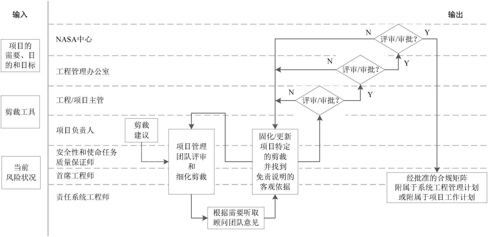 NPR 7123.1将“剪裁”定义为“在NASA系统工程需求规范设定的需求中,通过对需求做出缩减,找出与相应工程和项目目标匹配并适合于所容许风险和约束的需求描述”。剪裁可能导致产生针对系统工程需求的免责说明或允偏说明(见NPR 7120.5第3.5节),并在下一版本的系统工程管理计划(如以合规矩阵的形式)中记录和归档。