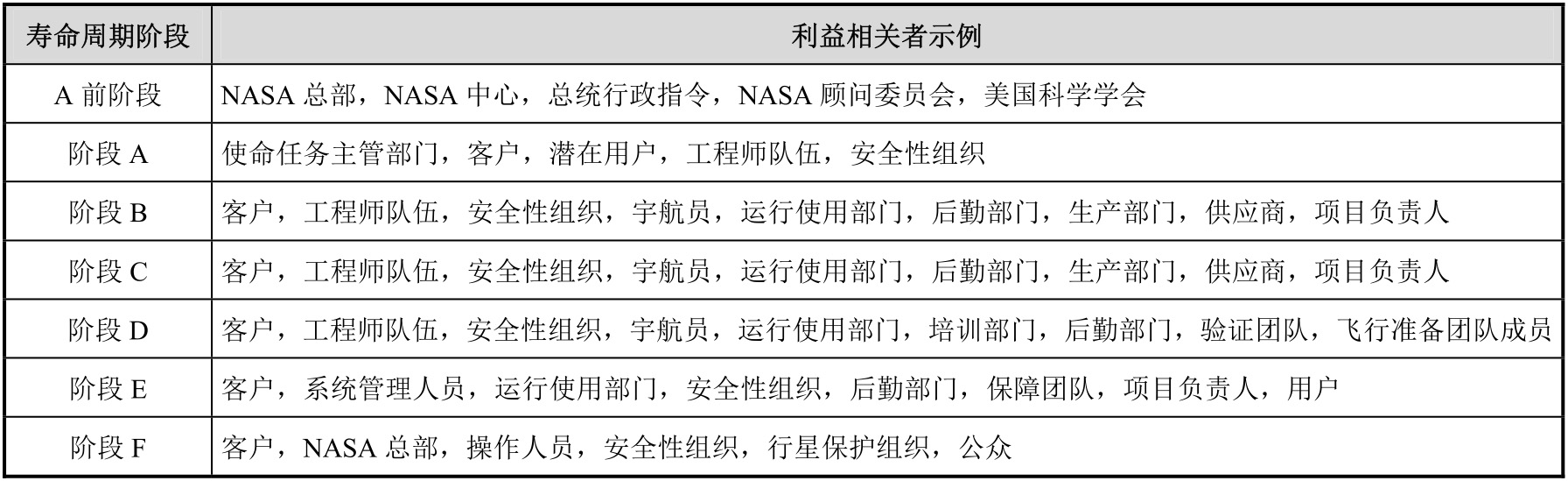 通常,系统的客户和用户容易被识别出。辨识出其他关键利益相关者可能会较为困难,他们会随着项目的类型及项目所处的阶段而有所不同。表4.1-1给出了在整个寿命周期各个阶段应当予以考虑的利益相关者的示例。