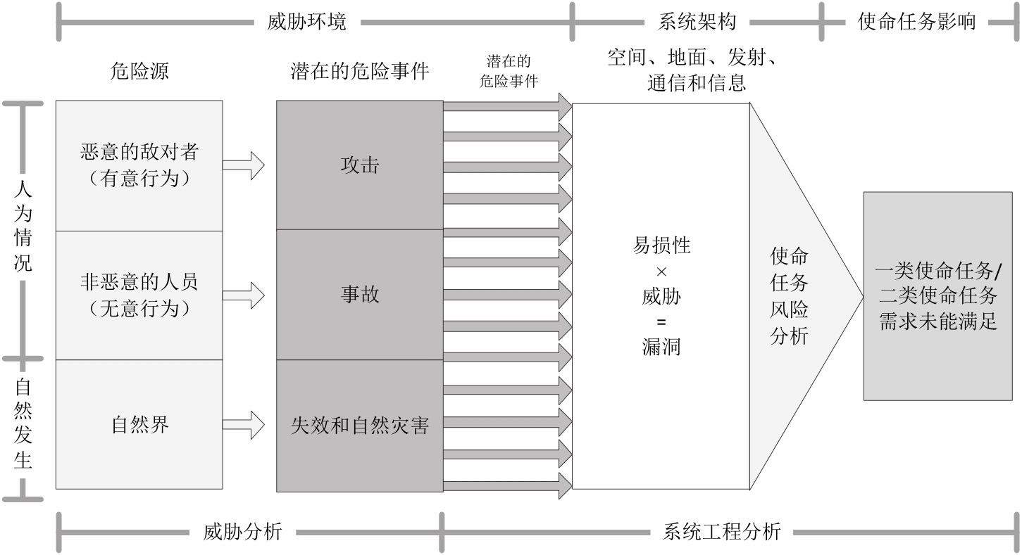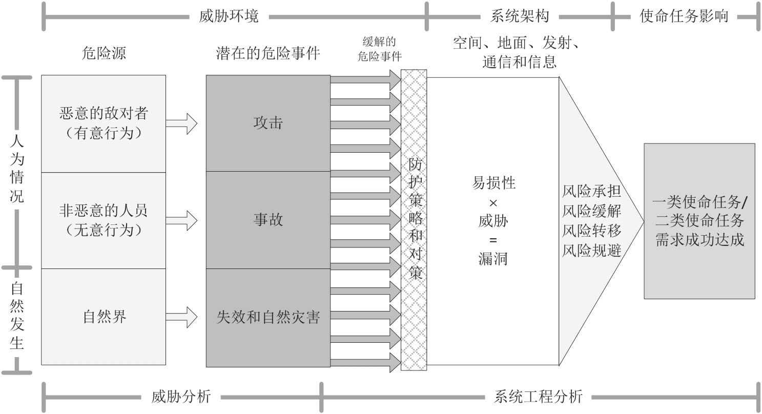 如图中的系统工程分析部分所显示的那样。这一概念由罗伯特·鲍尔在其著作《飞机作战生存能力分析和设计基础》中提出,这本著作属于飞机生存学科的开创性工作。当然,这个概念适用于任何系统,包括航天器和信息基础设施系统。诸如尺寸、结构、运行使用构想、通信链路和其他子系统等因素都可能导致系统产生固有的弱点。当这些固有的设计特征被潜在的威胁所针对时,系统的漏洞和弱点就会变得明显。这是在空间系统及其架构的设计方案开发领域的基本认知。图4.1-7中的方法与NASA空间资产保护计划所采用的方法的不同之处在于,在NASA使命任务的开发过程中,会考虑包括故意恶意威胁在内的各种威胁。