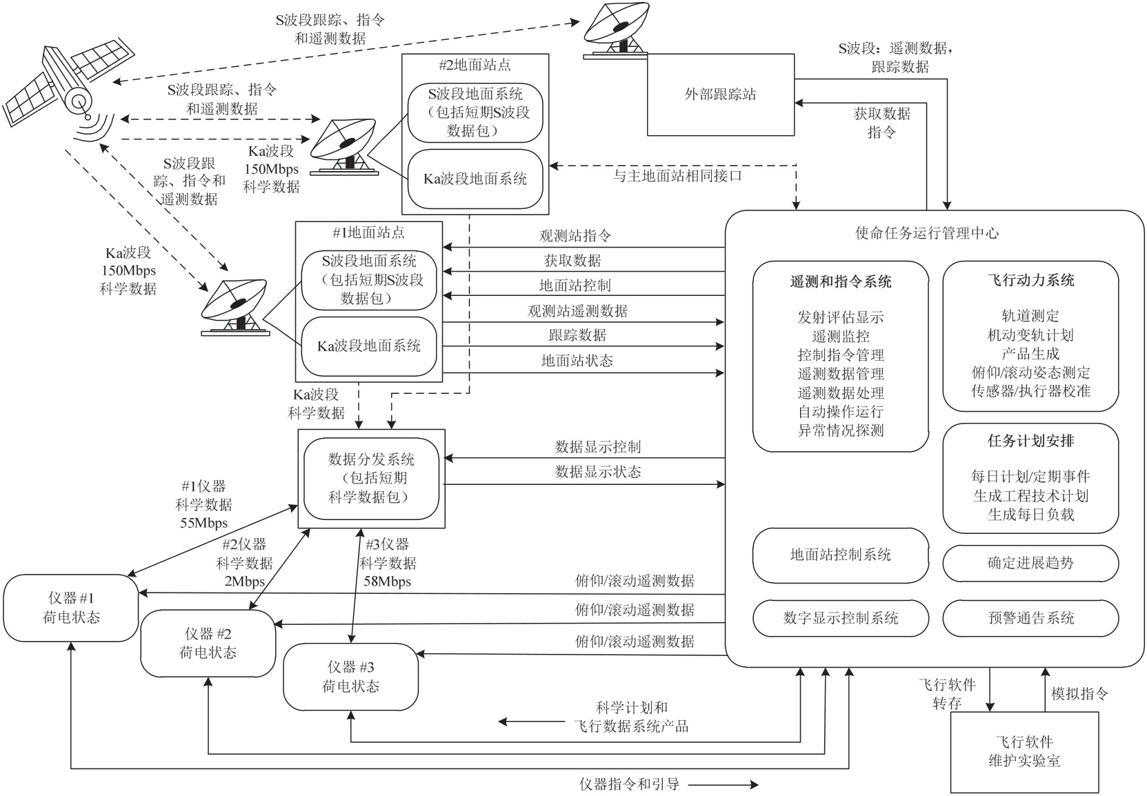 运行使用构想应考虑运行使用的所有环节,包括在集成、试验、发射直到废弃/处置的过程中那些计划内和非计划内的运行使用。运行使用构想中包含的典型信息有:主要阶段的描述、运行使用时间基线、运行使用场景和/或使命任务设计参考、故障管理策略、人机接口和所需训练水平的描述、系统端到端通信策略、指令集和数据架构、运行使用设施、综合后勤保障(重复补给、维护和组装)、人力资源水平和所需技能、关键事件等。运行使用场景的作用是描述系统运行使用的动态视图,例如,在各种模式下和模式转换情况下如何感知系统是否正常运行,这些模式包括通过外部接口的交互、对预计的风险和故障做出响应、实施故障缓解流程等。对于探索类使命任务,运行使用构想可以由多个使命任务设计参考组成。为适应系统需求而进行的设计分析和性能分析应当满足所有的使命任务设计参考。图4.1-3给出了科学试验型使命任务的典型运行使用构想开发流程,图4.1-4描绘的是一个端到端的运行使用架构示例。关于开发运行使用构想的更多指导信息,可参见本手册附录S。