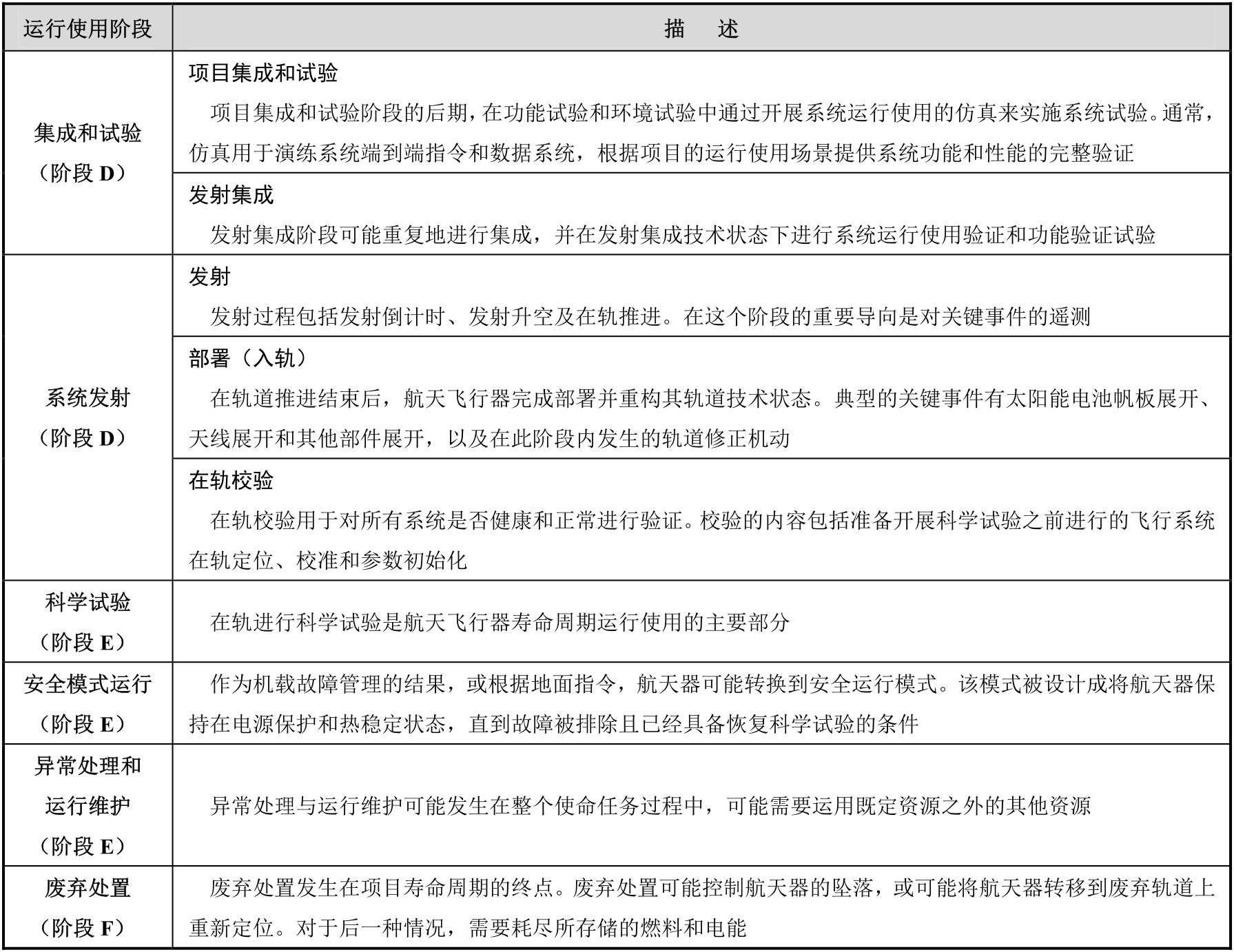 运行使用构想的一个重要内容是对运行使用阶段的划分,需要明确项目阶段D、阶段E和阶段F。针对为达到使命任务目的所需实施的技术状态变更和运行使用活动,运行阶段的明确划分可为此提供时序结构。所明确的每个运行阶段都应包括设施、装备和关键事件。表4.1-2给出了NASA使命任务的典型运行使用阶段的部分通用示例。