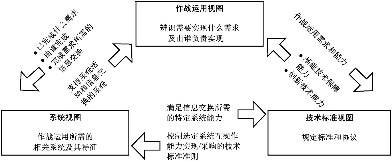 架构可以理解为“组件的结构及其相互关联关系,以及全程控制其设计与演化的原则和指南。”(基于美国电气和电子工程师协会(IEEE)的STD 610.12标准定义。)为了描述架构,DODAF定义了若干视图: 作战运用视图、系统视图和技术标准视图 。此外,还包括字典和综合摘要信息(见下图)。
