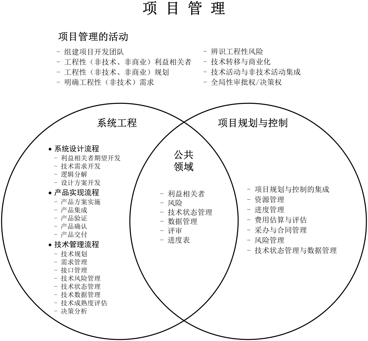 系统工程在项目的组织管理中发挥着重要作用。项目管理包含三个主要目标:管理项目的技术开发工作、管理项目的技术团队、管理项目的费用和进度,如图2.0-1所示,这三个目标相互关联。如同在NPR 7120.5《NASA空间飞行工程项目管理要求》中所讨论的那样,项目管理的职责是在特定的费用、质量和进度条件约束下,规划、监督和指导为满足客户和其他利益相关者的需要、目的和目标所需开展的诸多活动。同样地,NPR 7120.8《NASA科学研究与技术开发类工程和项目管理要求》中指出,工程或项目的领导者(如管理人员)负责科学研究与技术开发类工程或项目的规划和论证、实施和应用两个宏观阶段的工作;NPR 7120.7《NASA信息技术与NASA内部基础设施工程和项目管理要求》中指出,针对系统工程需求方面的工作,项目管理者应参考NPR 7123.1《NASA系统工程流程和要求》。图2.0-1中的系统工程区域关注的焦点是在技术、费用、进度三个方面做出决策需要体现的技术性特征;系统工程同时关注如何向项目管理者报告这些特征。项目管理者负责确保项目在费用和进度的限度范围内,最终能够交付系统。这些职责中存在重叠是自然的,其中,系统工程师重点关注系统在工程开发方面的成功(满足技术、费用、进度约束),而项目负责人则根据费用和进度的约束明确对工程开发可选方案的限制,确保系统能够成功交付。这些就是图2.0-1中系统工程和项目规划与控制重叠的领域。图2.0-1是解释这一构想的概念性示意图。注意图中作为项目管理两个基石的系统工程和项目规划与控制相互重叠的区域。在该区域中,系统工程为其输入技术性内容,而项目规划与控制为其输入工程、费用和进度方面的内容。