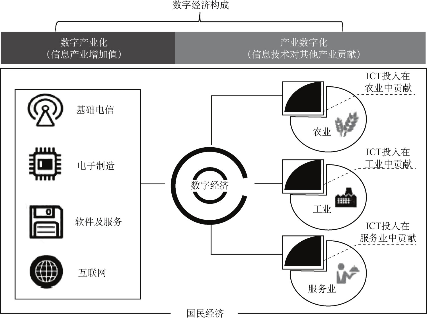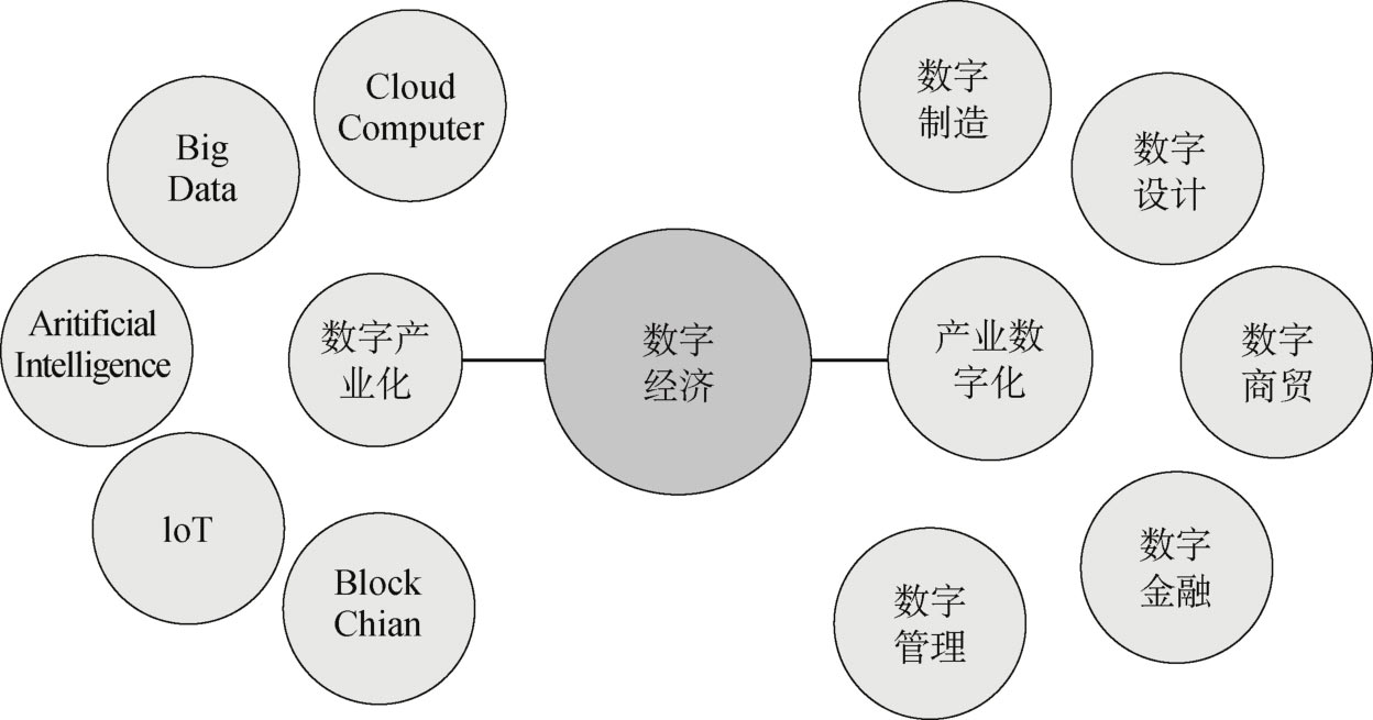 中国信息通信研究院在《中国数字经济发展白皮书》中指出:数字经济是继农业经济、工业经济之后的更高级经济阶段,是以数字化的知识和信息为关键生产要素,以数字技术创新为核心驱动力,以现代信息网络为重要载体,通过数字技术与实体经济深度融合,不断提高传统产业数字化、智能化水平,加速重构经济发展与政府治理模式的新型经济形态。同时提出了数字经济的构成,包含数字产业化和产业数字化两部分,如图1-1所示