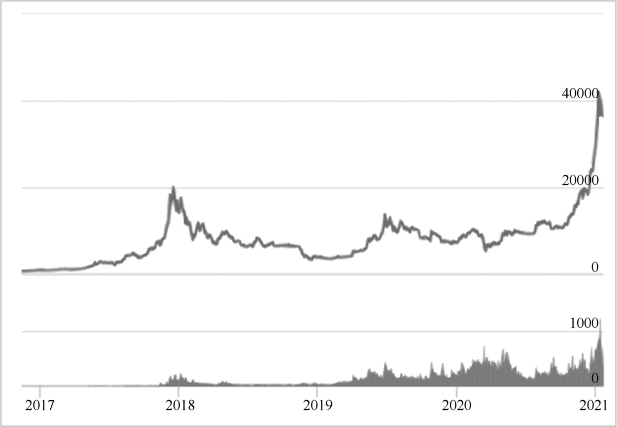 进入 2019 年,在 2 月 7 日当天跌至 3427 美元(收盘价)后,比特币价格即进入一个缓慢回升阶段,至 4 月初达到 5000 美元左右,由此开始长达一年半的在 5000 ~ 13000 美元的宽幅震荡。这样的“宽幅震荡”在任何股票或期货及其衍生物市场都可能是绝无仅有的。自 2020 年 10 月下旬开始,由于新冠疫情在国际上的恶化,以及国际政治和经济局势的严重不稳定性,比特币逐渐成为了一部分国际游资的避险资产品种,大量资金进入比特币市场,比特币经历了从 13000 美元( 2020 年 10 月下旬)至 41946 美元( 2021 年 1 月 8 日)的一轮单边疯狂涨幅,目前再次进入宽幅震荡,如图 2-1 所示。