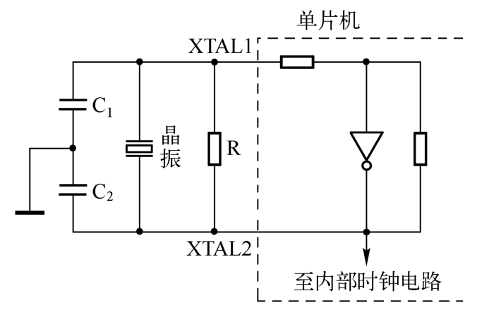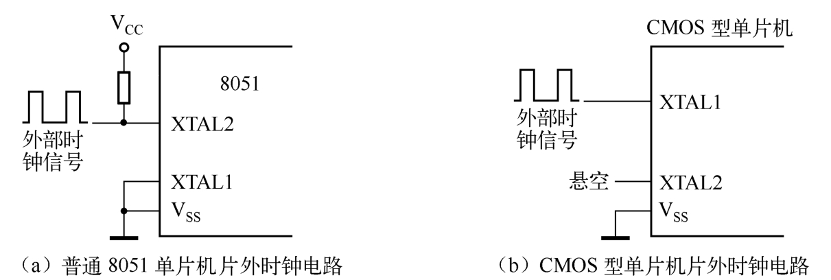 对于普通的8051单片机,外部时钟信号由XTAL2引脚接入后,直接送到单片机内部的时钟发生器,而引脚XTAL1则应直接接地,如图1-3(a)所示。