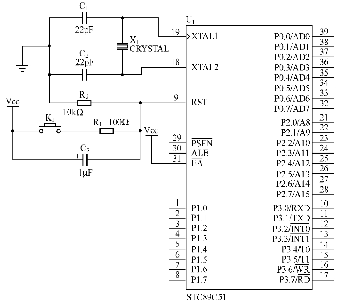 单片机最小应用系统又称单片机基本系统,是指用最少的元器件使单片机工作起来的一个最基本的应用系统。在这种系统中,使用STC89系列单片机的一些内部资源就能够满足硬件设计需求,不需要扩展外部的存储器或I/O接口等器件,利用用户编写的程序,单片机就能够达到控制的要求。