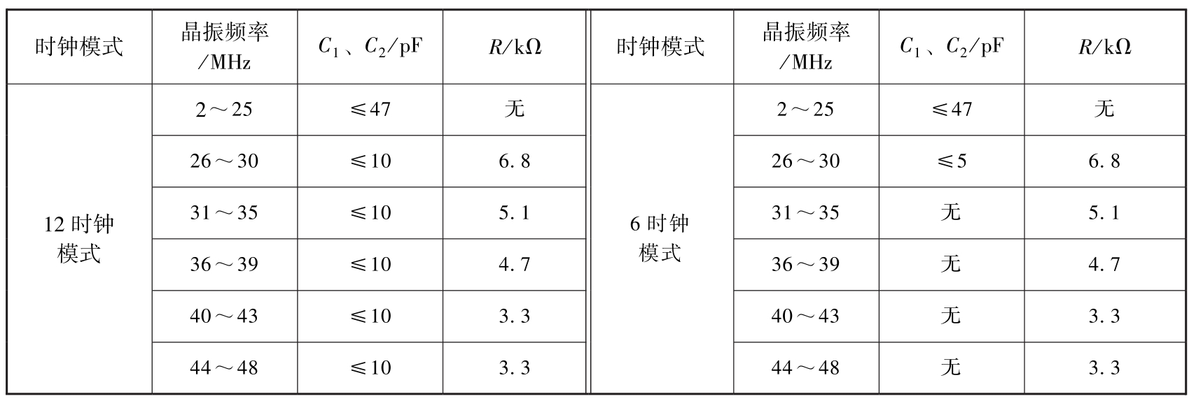 STC89系列单片机时钟电路中 R 、 C 1 和 C 2 的大小与单片机的时钟模式、晶振频率有关,见表1-1。STC89C5xD+和STC89LV5xD+单片机时钟频率范围见表1-2。