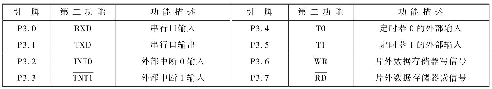 P3 (P3.0~P3.7):带内部上拉电阻的 8位准双向 I/O 端口。向 P3端口写入 1时,P3端口被内部的上拉电阻上拉为高电平,可作为输入端口,此时被外部拉低的 P3 端口会因为内部上拉而输出电流。P3端口的第一功能是通用 I/O端口,第二功能是控制端口(见表1-3)。