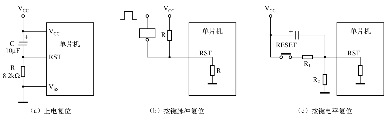 单片机通常采用上电复位和按键复位两种方式。图1-4(a)所示为上电复位电路,图1-4(b)和(c)所示为按键复位电路。