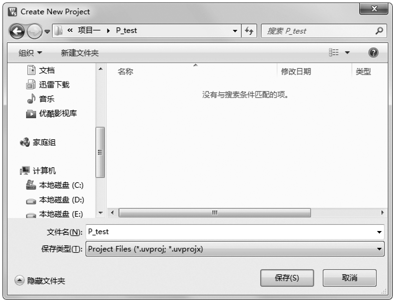 2 ) 创建一个新的工程项目 在图1-6所示界面中,执行菜单命令“Project”→“Close Project”,关闭已打开的项目。执行菜单命令“Project”→“New μVision Project”,弹出“Create New Project”对话框,在此对话框中选择保存路径,并输入项目名称,如图1-7所示。