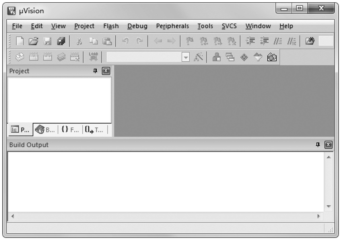 1 ) 启动Keil C51软件 双击桌面Keil μVision5快捷图标,弹出如图1-5所示的画面。之后,进入μVision5集成开发环境,如图1-6所示。