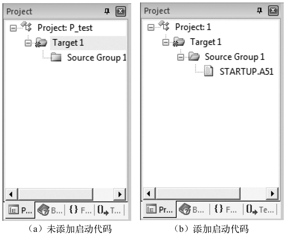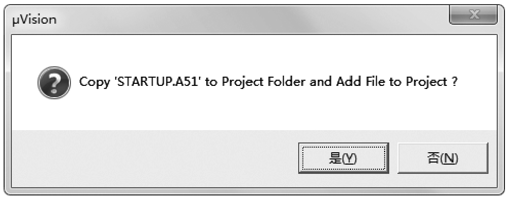 选择目标芯片后,单击“OK”按钮,弹出如图1-9所示的对话框,询问用户是否将标准的8051启动代码复制到项目文件夹并将该文件添加到项目中。在此单击“否”按钮,项目窗口中将不添加启动代码;若单击“是”按钮,项目窗口中将添加启动代码。这二者的区别如图1-10所示。