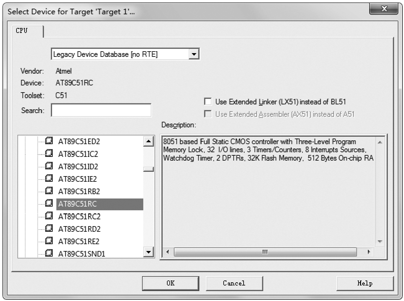 输入项目名称后,单击“保存”按钮,弹出“Select Device for Target'Target 1'…”对话框,如图1-8所示。Keil μVision5中没有 STC 单片机型号,可以用Intel公司的8052/87C52/87C54/87C58、Atmel公司的AT89C51/52/55/55WD或NXP公司的P87C52/P87C54/P87C58/P87C51RD+等替代。在图1-8中将其当作Atmel公司的AT89C51RC。