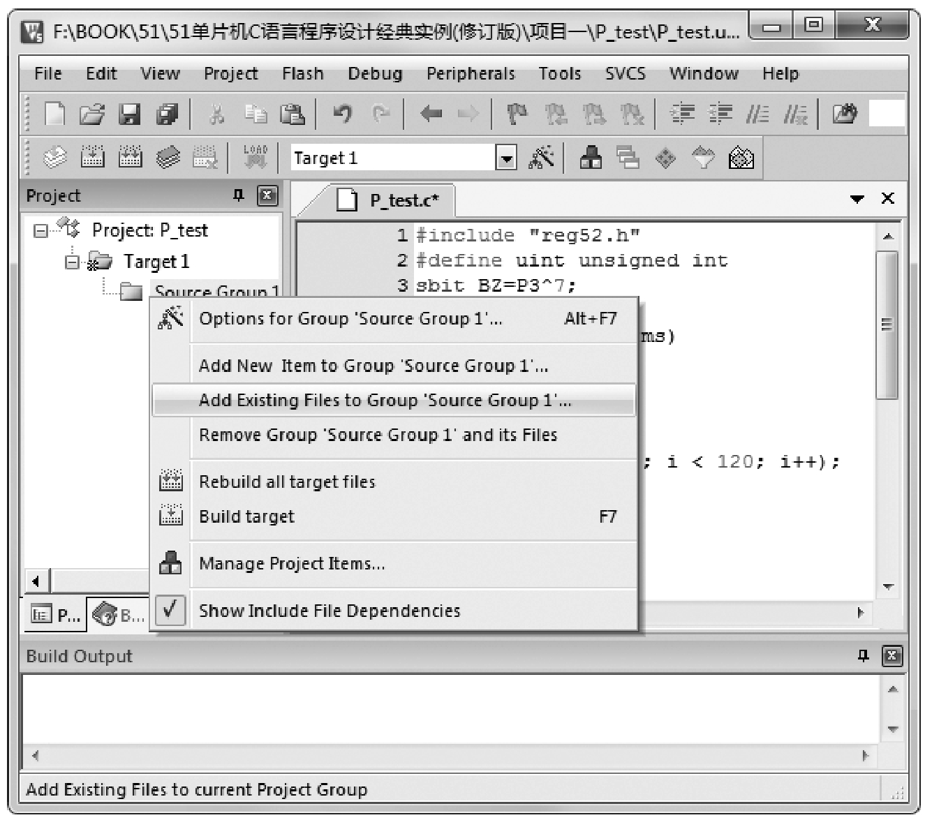 源程序输入好后,执行菜单命令“File”→“Save”,弹出“保存”对话框。在此对话框中输入保存的文件名称,保存时后缀名为.c。在项目窗口的“Target1”→“Source Group 1”上单击鼠标右键,在弹出的菜单中选择“Add Existing Files to Group'Source Group 1'”,然后选择刚才保存的源程序文件,单击“ADD”按钮,即可将其添加到项目中,如图1-11 所示。
