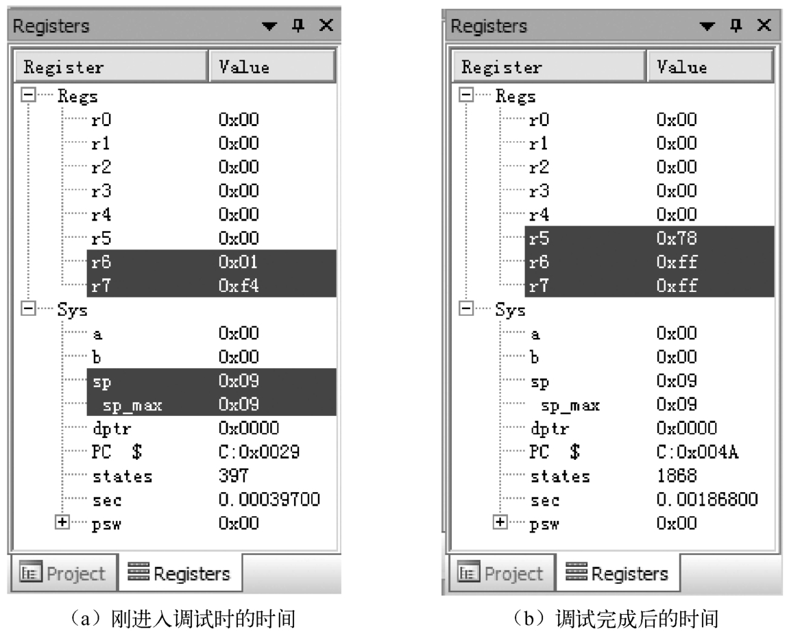 图标,进入调试状态。刚进入调试状态时,项目工作区(Project Workspace)“Registers”选项卡的“Sys”项中sec值为0.00039700,如图1-15(a)所示,表示进入调试花费了0.00039700s。单击