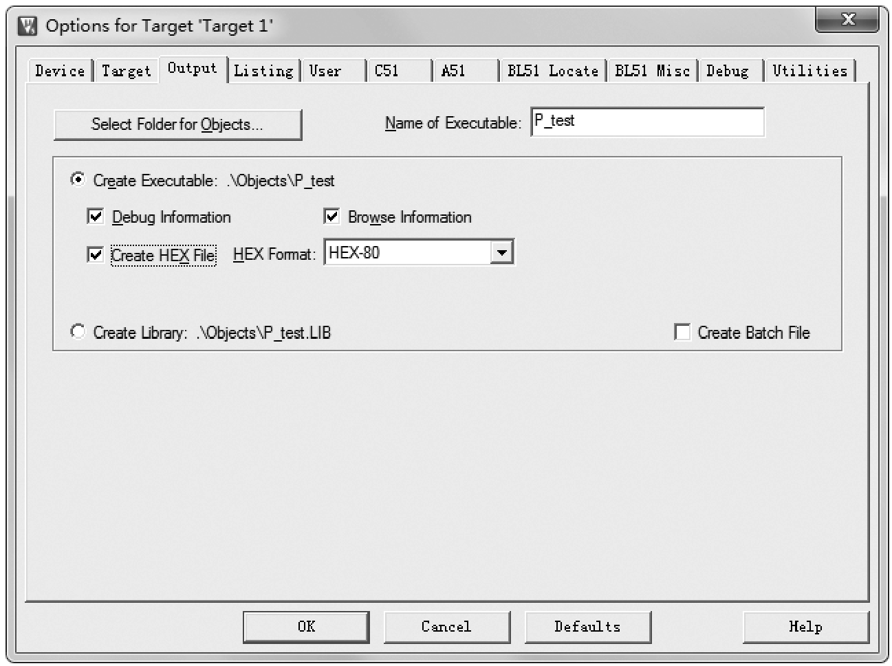 图标,然后在弹出的“Options for Target'Target 1'”对话框中选择“Output”选项卡,选中“Create HEX File”选项即可,如图1-12所示。