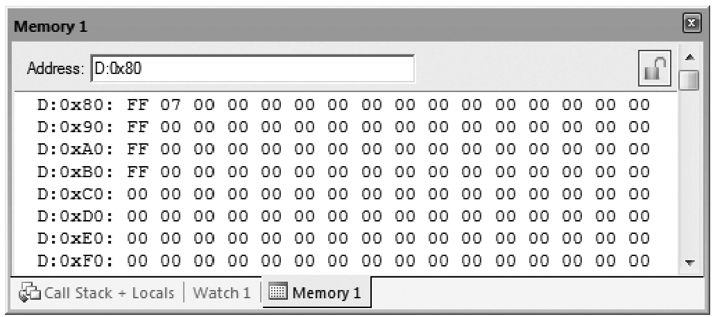 图标将其打开)。在存储器窗口的上部,有供用户输入存储器类型的起始地址的“Address”栏,用于设置关注对象所在的存储区域和起始地址,如“D:0x30”。其中,前缀表示存储区域,冒号后为要观察的存储单元的起始地址。常用的存储区前缀有d或D(表示内部RAM的直接寻址区)、i或I(表示内部RAM的间接寻址区)、x或X(表示外部RAM区)、c或C(表示ROM区)。由于P0端口属于SFR(特殊功能寄存器),片内RAM字节地址为80H,所以在“Address”栏中输入“D:0x80”时,可查看P0端口的当前运行状态,如图1-14 所示。