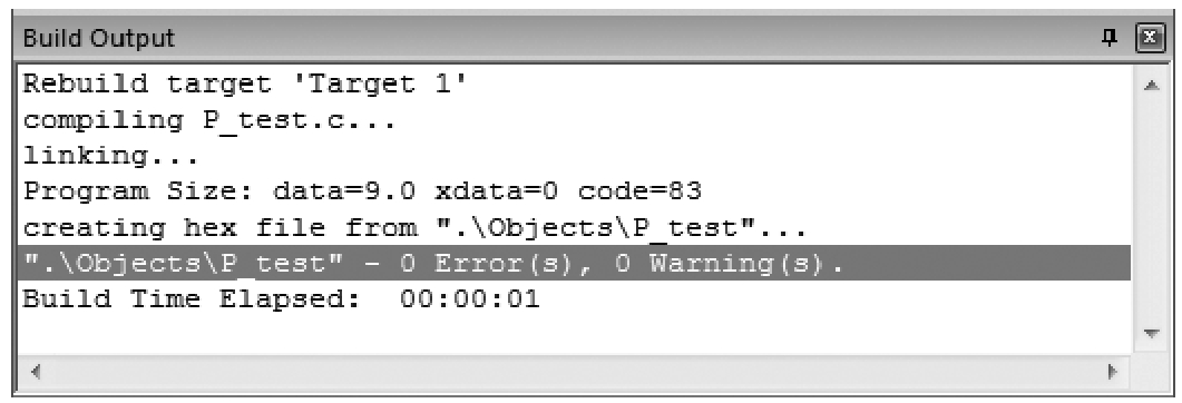设置好后,再次进行编译,如果源程序文件没有语法错误或警告提示时,将会在编译输出窗口(Build Output)中显示已创建一个以.HEX为后缀名的目标文件,如图1-13所示。