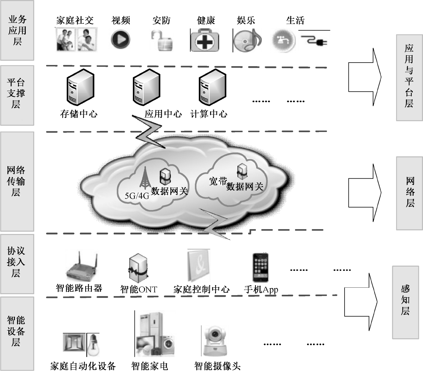 在这种架构下,传感器通常会集成在智能设备内,同时智能设备也会内置相关的通信协议。而在协议接入层,由于大部分家庭内都会安装家庭网关、家用路由器等接入终端。这些家庭接入终端具备智能家居控制枢纽及无线路由两大功能,一侧负责具体的与通过有线或无线接入的智能设备间的安防报警、家电控制、用电信息采集等数据交互,另一侧负责通过4G/5G、xDSL、xPON打通家庭网络设备与外部网络的连接。而在平台支撑层,目前基于云化部署的控制平台通过负载均衡等技术保证了各类接入的稳定性与安全性。在业务应用层除针对安防、健康、娱乐等不同种类的垂直服务之外,大数据分析与人工智能也在大量积累的基础运行数据上发挥越来越重要的作用。