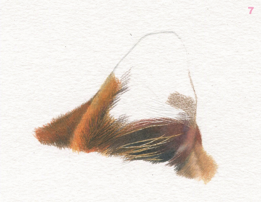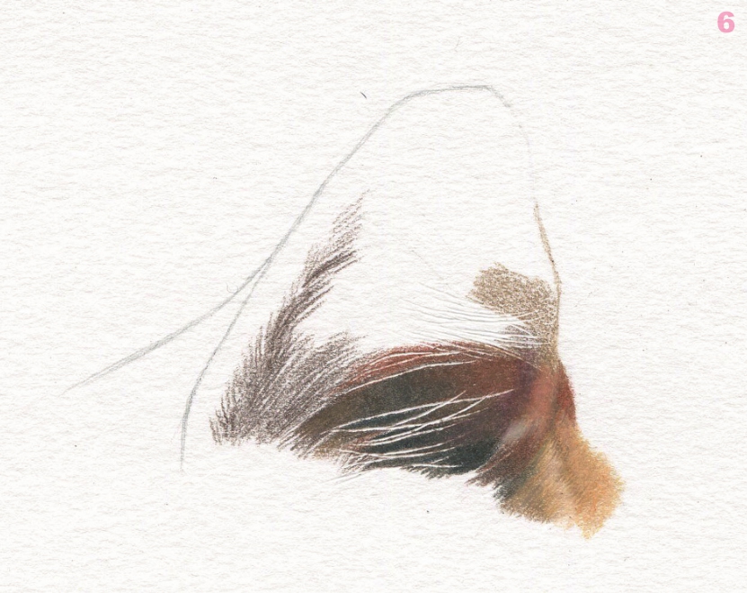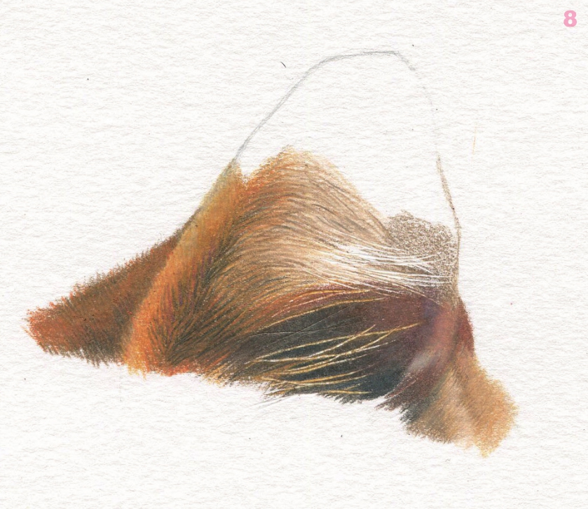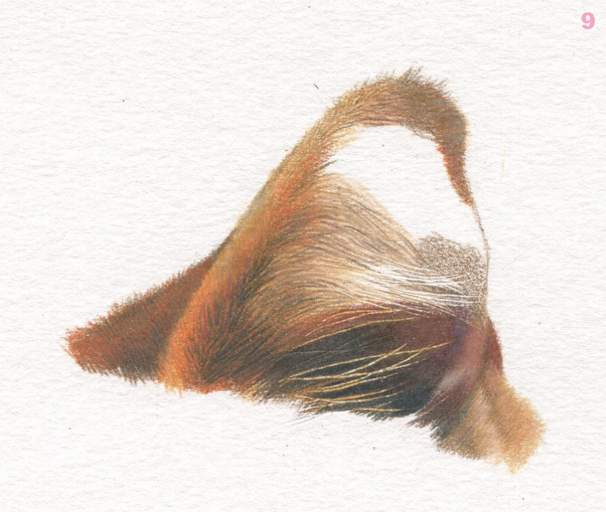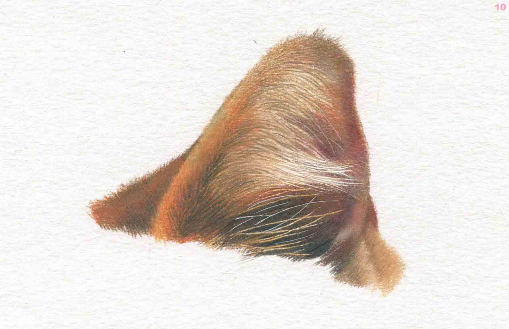 继续画耳朵内部毛发,局部较亮的毛发可以用高光笔提出来。 PC948 、 PC941 、 PC1085 、 PC1033 、 PC1081 、 高光笔