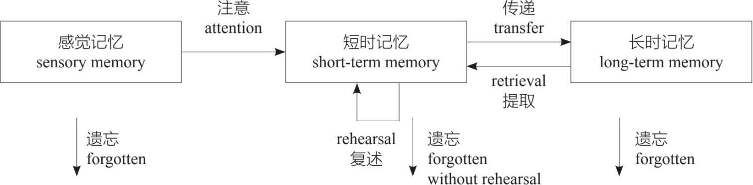 (2)记忆的储存加工分为三个阶段:感觉记忆(Sensory Memory)、短时记忆(Shortterm Memory)和长时记忆(Long-term Memory)。感觉记忆是临时储存经过感官处理的信息。一般而言,感觉记忆储存时间极短,视觉信息储存时长为 1/2 秒(Sperling,1960),听觉信息储存时长为 2 ~ 4 秒(Darwin,Turvey,& Crowder,1972)。随后,感觉记忆如果被编码,就会传递到短时记忆,进行再一次的短暂储存。如果没有复述,信息在短时记忆中至多维持 30 秒(Atkinson & Shiffrin,1971)。