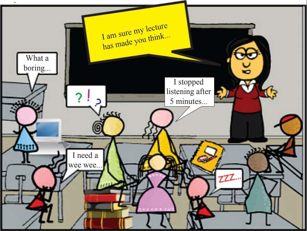 下图中,老师说她的讲座可以帮助学生思考。可是学生反应各不相同,你能试着用记忆模型来解释图中各位学生的具体情况吗?哪些同学听到的讲座信息只传递到了感觉记忆?哪些同学听到的讲座信息传递到了短时或工作记忆?哪些传递到了长时记忆?