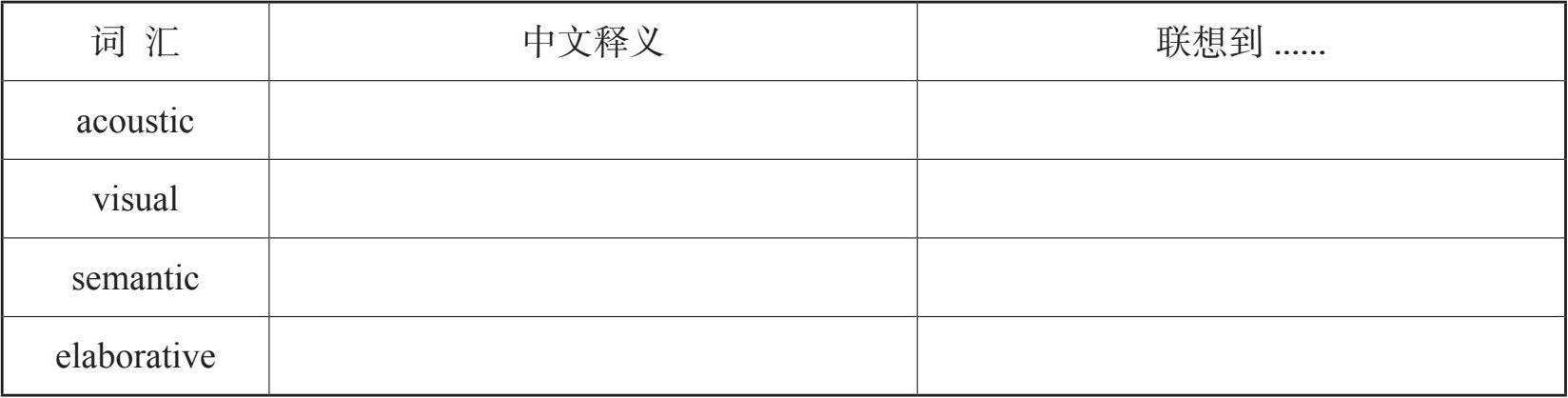 如何记忆下列词汇更有效?请在下列方框中写出/画出你的记忆方法,并与身边的同学和朋友分享。