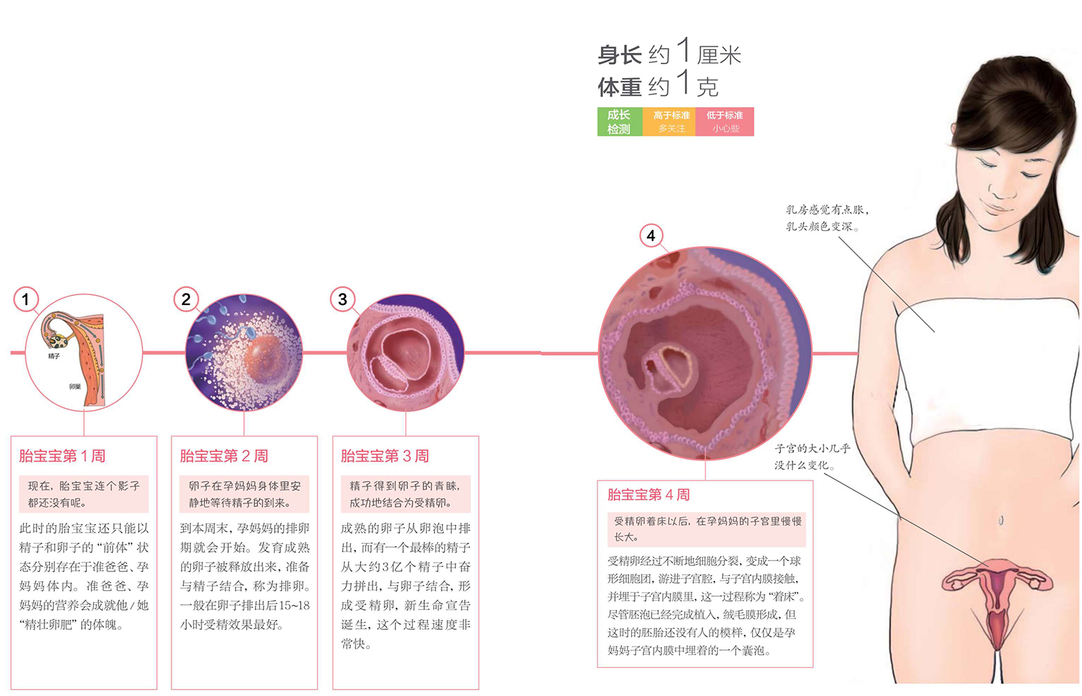 不知不觉中,一个小生命已经在你温暖的子宫内安营扎寨了。在这个月,他/她发生了脱胎换骨的变化,从精子、卵子的形态到小生命的萌芽状态,你的怀孕历程就这样开始了。