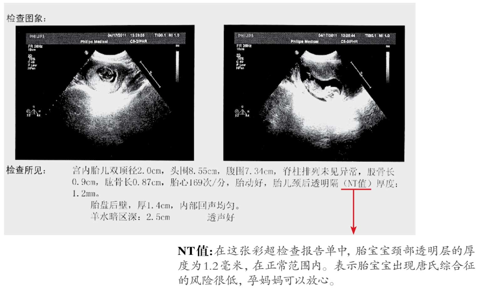 NT(Nuchal Translucency)是胎儿颈部透明层厚度的缩写。胎儿颈部透明层厚度与唐氏综合征缺陷正相关,所以这项检查被认为是筛查唐氏儿有效的早期指标。为了更精确地计算胎儿出现异常的可能性,NT检测会将一些至关重要的信息,比如孕妇的年龄,也一并考虑进去,最终给出胎儿患有唐氏综合征的风险概率。