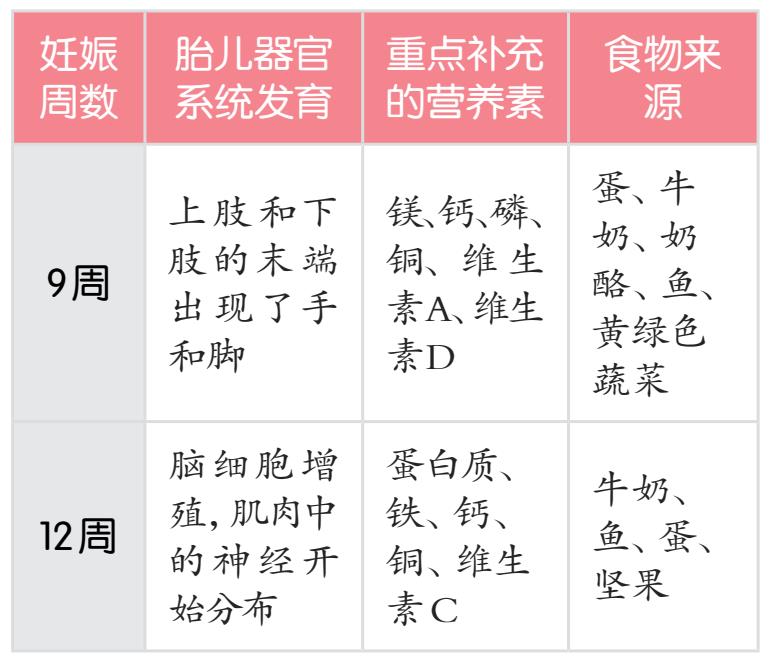 胎宝宝每个阶段的器官系统发育都有所变化。孕妈妈除了注意补充必需的脂肪酸及钙、磷等矿物质外,还要补充适量的维生素,包括叶酸、维生素B6、维生素B 12 等。保证均衡饮食,不仅可以提高孕妈妈的免疫力,而且对胎宝宝的生长和发育大有裨益。