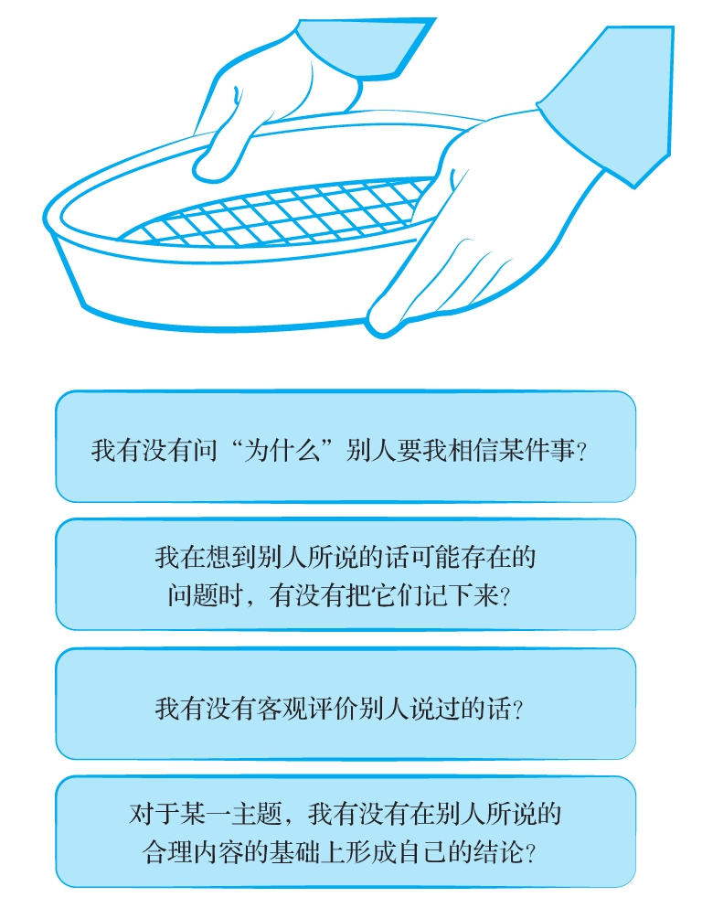我们把这种互动的方式称为“ 淘金式思维 ”。淘金的过程为积极主动的读者和听众提供了一种可效法的模式,在他们想要判断自己的所见所闻有多大价值时可以借鉴。要想在对话的过程中披沙拣金,就需要不断地提问并思考问题的答案。