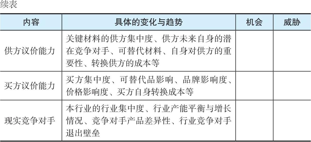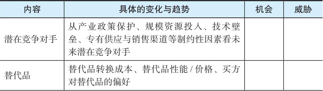 波特五力模型是一个应用广泛的战略决策工具。在管理咨询的实践中有人提出对波特五力模型进行改进,增加了其他特殊利益群体(即其他战略利益相关者)的分析维度,例如汽油行业的变化会影响汽车行业的需求与竞争格局等。在运用波特五力模型对行业环境进行详尽扫描后,可以填写如表2-4所示的波特五力分析总表,简明扼要地陈述行业竞争力量的关键点,把握判断外部行业环境所面临的机遇和威胁。