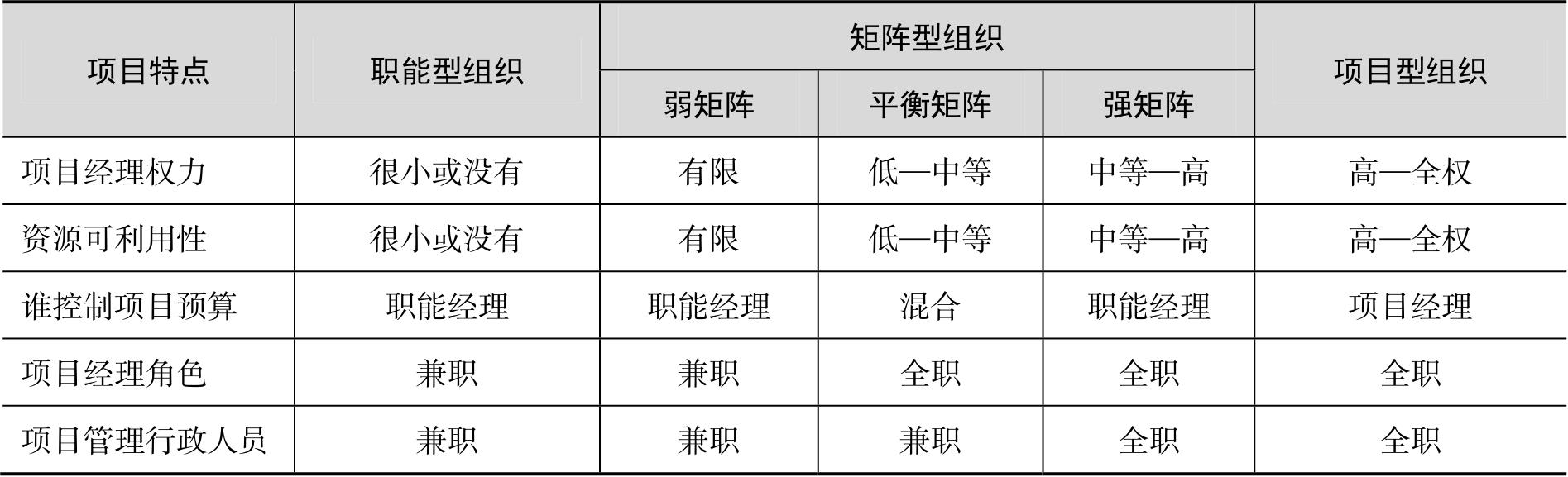 并不存在绝对完美的项目管理组织,每种组织都有优点和缺点。不可否认的是,项目管理在组织内部的重要性逐渐被强化,且扮演着越来越重要的角色。表5-1为项目管理的组织结构及其特点,用于比较不同类型的项目组织中的角色及其影响力的差异。