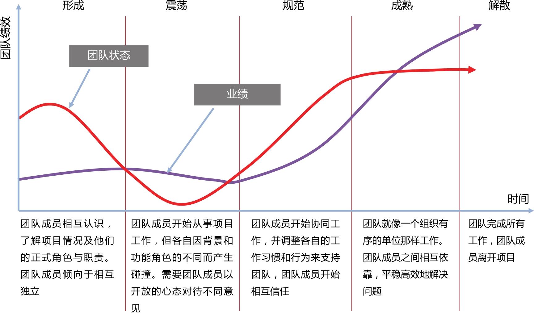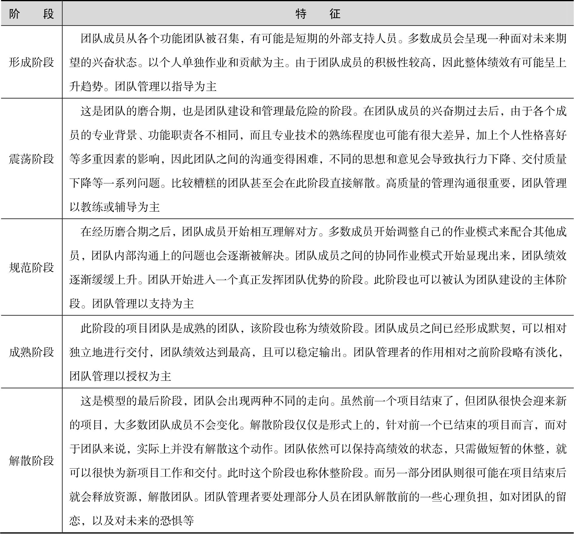 塔克曼模型解释了团队在不同阶段时团队的表现特征。深刻理解该模型可以帮助项目经理了解他的团队状态,并根据团队所处的阶段及时做出相应的管理手段(见表5-4)。该模型的普适性非常好,可以被应用在绝大多数项目团队的管理和建设上。该模型描述了项目绩效随团队发展阶段的变化曲线,其基本的四个阶段是形成、震荡、规范与成熟。解散阶段是模型的增补阶段,因为有些团队可能长期存在,而有些团队则会在项目结束后解散,这两种团队会出现不同的发展趋势,对应的管理模式也不同。塔克曼模型可以和情境领导等管理模型结合使用。表5-4显示了该模型各阶段的典型特征,图5-1显示了该模型在不同阶段团队绩效的典型表现差异。