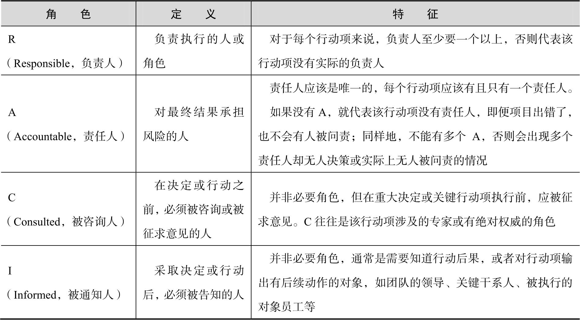 作为一个团队,其首先要完成职责的划分,一个最基本的工具就是RACI矩阵。RACI矩阵为团队中的每个角色都做了基本设定,以明确各自的职责和工作范围。表5-2是 RACI各角色的定义与特征。