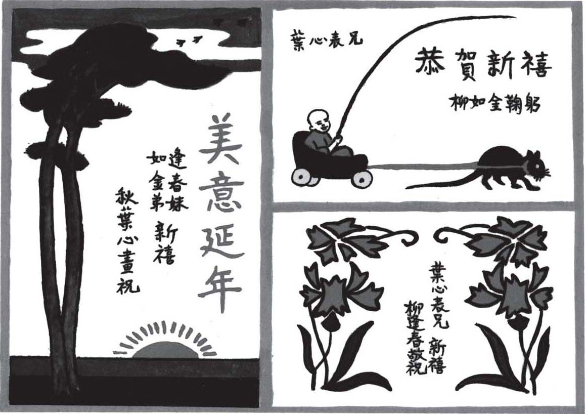 我们把画具端到楼上,放在东窗下的桌上,开始画贺片了。画些什么呢?我就问爸爸明年是什么年。爸爸说明年是丙子年,子年可以画个老鼠。但我所发见的题材,被弟弟抢了去。他说:“我画老鼠!老鼠拉车子!昨天我在《小人国》里看见过的。”我同他论理,但他连说“对起,对起,对起,对起”,管自拿铅笔打稿子了。“对起”就是“对不起”,是他近来的口头禅。他每逢自知不合而又不舍得放弃的时候,便这样说。我知道他已热心于画老鼠拉车了,就让让他吧。但是我自己画什么呢?想了好久,记得以前华先生教我们画花的图案,我画得很高兴。现在就画些花的图案吧。