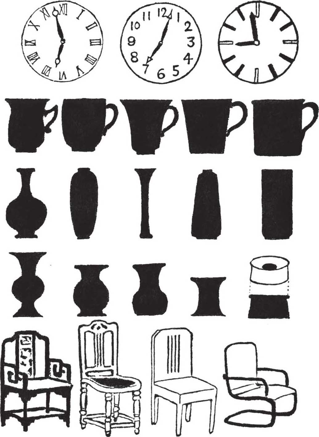 回到家里,把在舅家的所见告诉爸爸。爸爸说:“各种器物,都有繁简种种形式。大概从前的人欢喜繁,现在的人欢喜简。”他随手拿铅笔在一本拍纸簿上画给我们看,一面说着:“譬如钟,以前用细致的罗马字,后来改用简明的阿拉伯字,现在连阿拉伯字也不要,只用一条线。又如茶杯,花瓶,痰盂等,以前大都用S曲线,后来曲线改简,用括弧形的,或X形的。有时索性不要曲线,而用不并行的直线,或竟用并行的直线。又如椅子,从前的太师椅,曲曲折折,噜噜苏苏。”弟弟指着爸爸描出来的图,插口说:“外婆坐的就是它!”爸爸又描一只椅子,继续说:“不必说外婆,就是你姆妈房里的藤穿椅,脚上一轮一轮的,一段一段的,也噜苏得很。所以后来就不流行,改用直线的脚。再简起来,就是娘舅家的钢管椅子。其他桌子,眠床等,也都有同样的变化。建筑也是如此。旧式房子形式繁复,新式房子形式单纯。将来你们到大都市里去,可以看见许多实例呢。”爸爸放下铅笔,结束地说,“建筑和工艺美术同一潮流。这潮流是从人的思想感情上变出来的。”