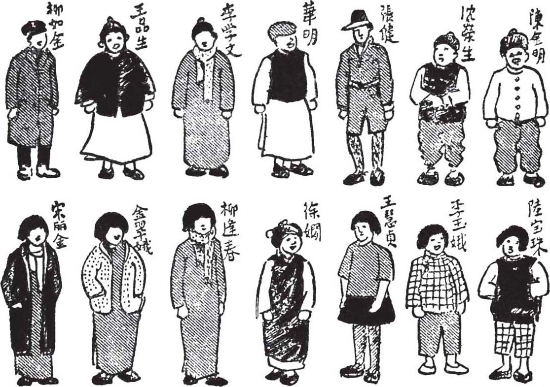 不多时,华先生写好了,把速写簿递给我们看。他描着七个人的“斯侃契”,服装也各人不同:宋丽金黑大衣里面衬着白围巾,样子最好看。金翠娥旗袍上罩毛线短衣,一股摩登气,在画里看看也不觉得十分讨厌。徐娴旗袍上罩着旗袍背心,戴着缀花球的绒帽子,傻头傻脑的,很是可爱。王慧贞端正地穿着短衣短裙,样子最是老成,像个中学生。李玉娥格子布短衣、短裤,像个小丫头。陆宝珠黑色的短棉背心,格子布裤子,歪着头,把手插在背心洞里,活像一个乡下姑娘。还有一个戴围巾,穿长衫,满头黑发的人,大家说是我。我自己却不认识,看了觉得很奇怪。