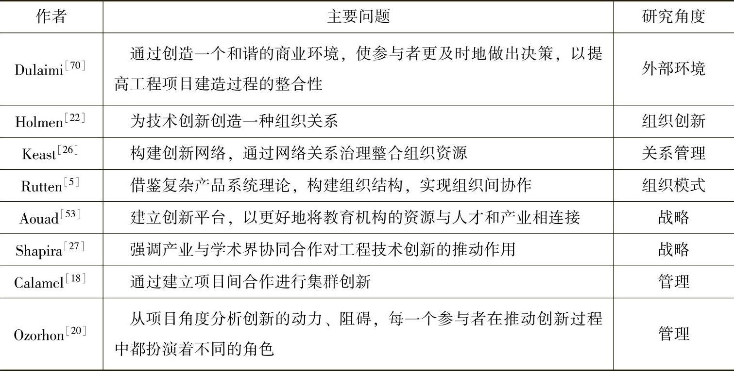 工程项目技术创新在技术要素层面上要求多个学科、多种技术的组织与集成优化,是把技术与经济、社会、管理等要素在一定边界下进行优化集成的过程 [81] ,需要技术创新与管理创新的协同整合 [82] 。通过提高战略、文化、制度、组织(结构与流程)等要素与技术要素的适应性,实现核心要素与支撑要素的协调匹配。工程项目技术创新协同模式相关研究见表1-2。