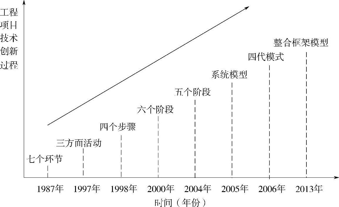 之后,工程项目技术创新过程模型发展至“四代”创新过程模式。该模式描述了项目当事人(创新者和采纳客户)之间的必然联系,肯定了以往的研究成果,强调了创新实施和扩散过程中创新主体之间关系的重要性 [61] 。多主体对创新过程的影响也受到关注,相关研究逐渐突破了从单个企业层面对技术创新过程的分析。考虑多主体环境影响,综合驱动力(Drivers)、投入(Input)、活动(Activities)、参与主体(Participants)、影响因素(Enablers and Barriers)、产出(Benefits)等要素,在项目层面构建了技术创新的整合框架模型 [19] ,从项目层面对技术创新过程进行分析,有助于加深对工程项目创新跨组织特性的理解。工程项目技术创新过程模型具体演变过程如图1-3所示。