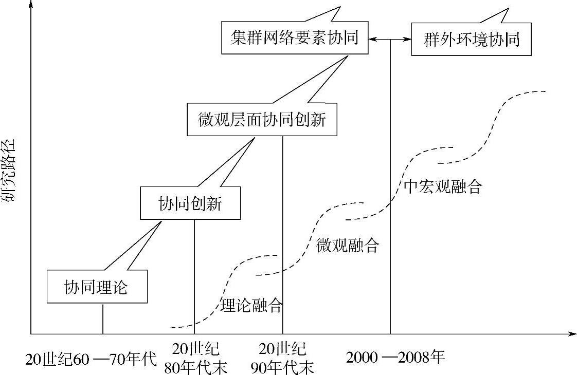 协同概念也逐渐被引入创新研究领域。最初,众多学者在国家、区域等不同层面展开技术与制度协同创新研究,从技术体系和制度结构协同演化视角对企业创新系统进行解释。随后,又有学者从产学研协同的角度分析公共研究机构、企业以及大学间的协同推动新产品开发等问题,将协同问题研究逐步推向对创新成员、创新要素之间协同关系的研究;还有学者从微观角度研究网络协同创新中的知识协同及知识互补性等问题,直至后来从创新整体模式视角进行相关研究等。当前,协同创新相关研究正不断向外围扩展,逐渐渗透到多学科、多领域。解学梅从集群协同创新的角度对协同创新相关研究进行梳理,归纳总结了协同创新的研究脉络,如图1-4所示 [91] 。