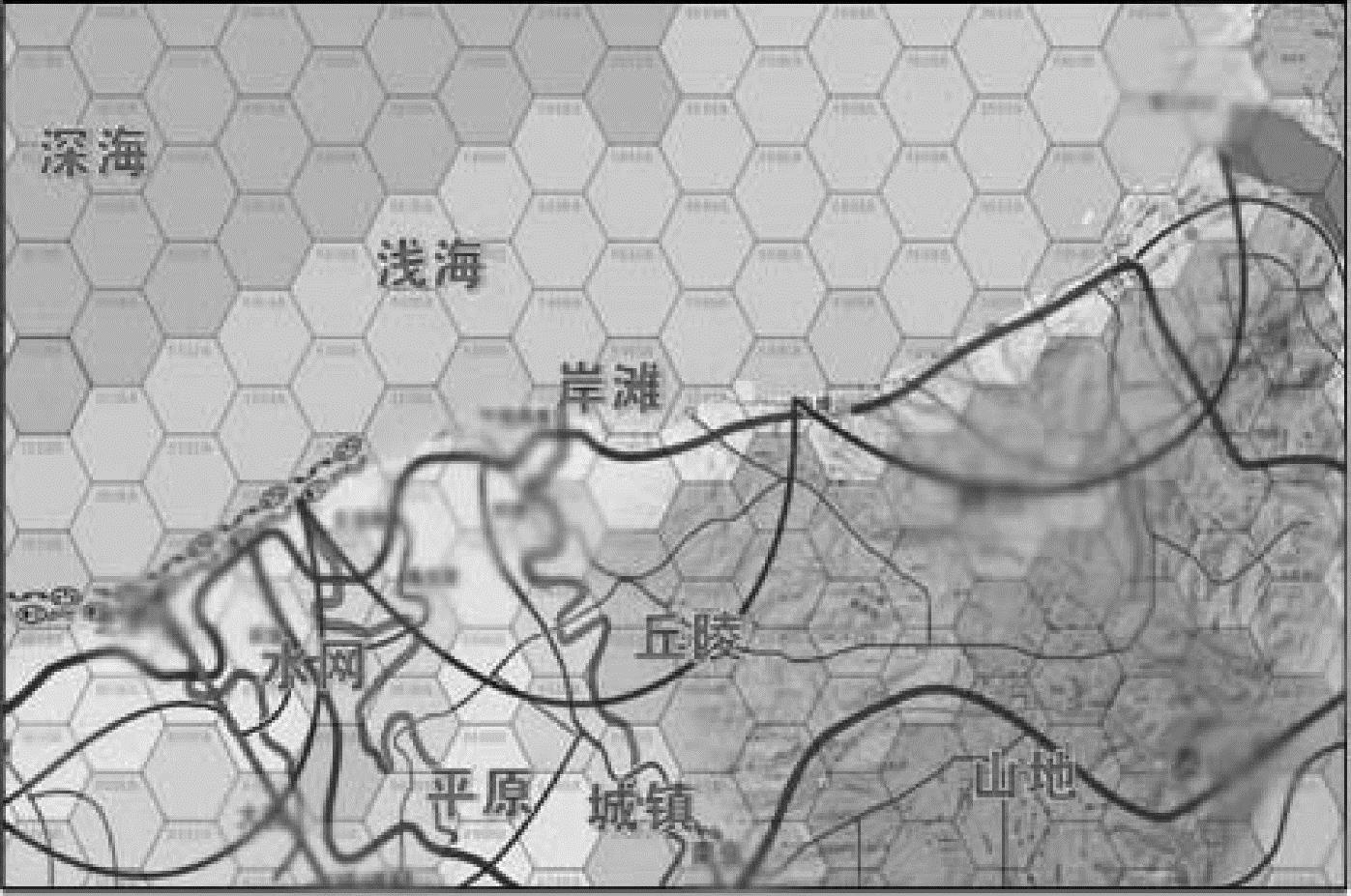 地形是地貌和地物的总称。地貌是指地表物质的起伏形态和性质(即地貌与地质)。对地貌的量化通常采用不同的颜色来区分不同的地貌,如图1.4所示。每个棋格都用一种颜色或符号标示,分别代表一种地形。例如深海六边形绘成深蓝色,而浅海六边格绘成浅蓝色等。地物是指地面上位置固定的物体。地物的量化通常采用“注记棋子”的方式来完成(后面结合“棋子”介绍)。战场环境的量化,包括自然的地理环境和电磁环境等内容。