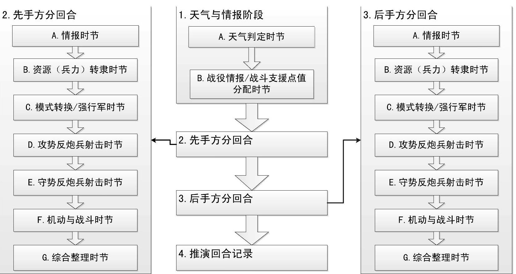 推演规则主要是指针对如何确定先手方、推演程序等内容的规定。推演程序,是对推演和裁决机制的人为规定,决定了推演各方如何进行交互对抗,以及各种行动按照什么顺序进行裁决。推演程序又可分为推演流程和裁决流程,是手工兵棋能够顺利组织对抗推演的必要条件。在手工兵棋中,对抗各方需要严格按照推演流程来完成相关的操作,所以推演者感受非常明显。图1.9是“北约师指挥官”这款兵棋对抗式推演的基本流程。对抗双方需要严格按该流程完成相关的决策与操作。层级越低的手工兵棋,推演流程往往规定越细致,分队级的兵棋中甚至会规定推演各方每个回合中每一类行动的次数,譬如,每个回合的火力射击时节只能够进行X次间瞄射击、只能够进行X次机动等。而计算机兵棋(并非计算机化的手工兵棋)中,即使采用回合制推进,对抗各方也不再是交替决策和指挥,各种行动主要是按指定的时间来模拟和裁决,行动命令不需要按严格的次序来下达,因此推演者对此感受不深。尤其是实时制的计算机兵棋中,通常不再规定具体的推演流程。但是,对于每一类行动的模拟,需要根据行动分辨率来确定其基本的逻辑流程,合理地反映该行动的机理,只是这已经不属于推演规则,而是属于行动的逻辑规则。