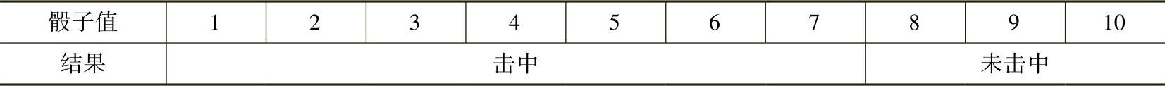 手工兵棋的骰子,通常包括六面骰子和十面骰子。六面骰子每一面上分别标示1~6的数字,十面骰子则每一面分别标示1~10的数字。六面骰子和六边格可以直接对应。例如:伞降时可能产生偏移,如果偏移到周围6个六边格的概率相等,那么用1~6分别指代周边的6个六边格,掷骰子得到哪个数字就裁决偏移到该数字对应的六边格。相对而言,十面骰子使用更多,尤其是当行动概率需要区分更为精细时,可以使用2个十面骰子来裁决,一个骰子值代表十位数字,另一个骰子值代表个位数字,分别代表1%—100%的概率。兵棋推演中,多数作战行动都要确定一定概率,建立行动裁决表,再通过掷骰子来裁决结果。例如:在战斗结果表里,某种防空武器对飞行高度为1500米的某型号直升机的毁伤概率是70%,则用十面骰子投掷时,掷到的骰子值数为1~7的任意一个数时,就判定该架直升机被击毁;否则,就判定未被击中,如表1.1所示。在计算机兵棋中,这样简单的概率事件通常直接取随机数进行对比即可,但是一些复杂的行动裁决仍然需要建立裁决表,并且对于各种事件的过程分解及其每个过程可能结果的概率分析,区分会比较详细。美军JTLS的DDS中建立了上千张裁决表,有的裁决表长达几千行之多。