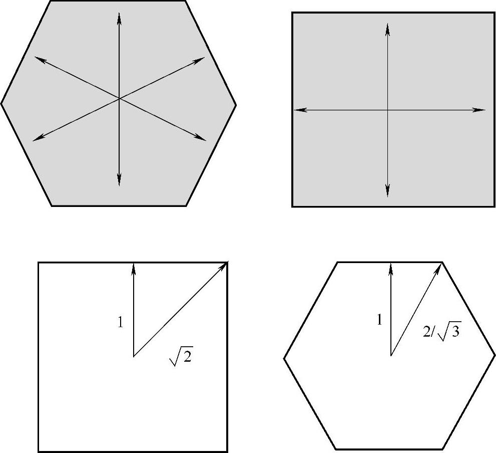 距离的量化通常采用正六边形网格,即俗称的蜂窝状排列结构。其原因主要有三方面:一是在正多边形中,只有正三角形、正方形、正六边形(六边格)能对平面进行无缝拼接。二是兵棋推演时,棋子通常是按格机动,只有六边格的等距离方向最多,为6个,而正方形的等距离方向只有4个。三是计算机动距离时,六边格的误差最小。正六边形6个对角线方向的误差为2/3=1.15,而正方形4个对角线方向的误差为2=1.41,如图1.3所示。