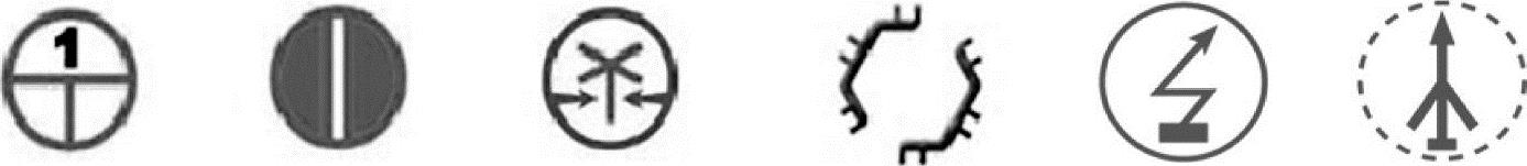 地物注记,主要用来表示作战区域内的道路、桥梁、机场、港口、交通枢纽、坚固工事、空降场及机降场等设施。典型的地物注记如图1.6所示。地物注记通常要参照相应的军队标号进行设计,如果没有该地物的军队标号,则通常要参照该地物的外观特征来设计。