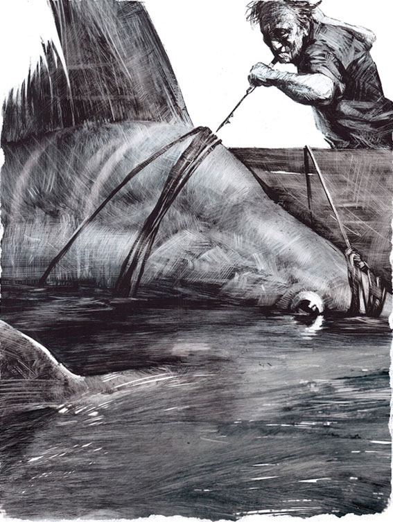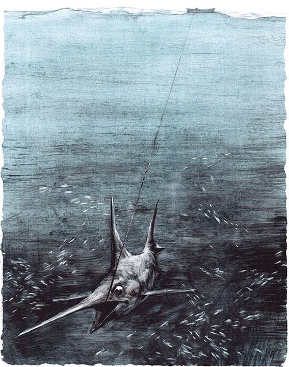 他看见那鱼的脊骨像一条裸露的白线,还有黑暗一团的头部和向前伸出的细长的尖嘴。