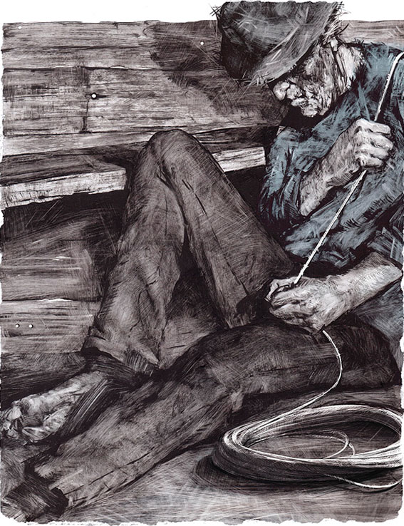 他所有的一切都是苍老的,只有他那双眼睛除外。他的眼睛蓝得像海水,欢快而不屈。