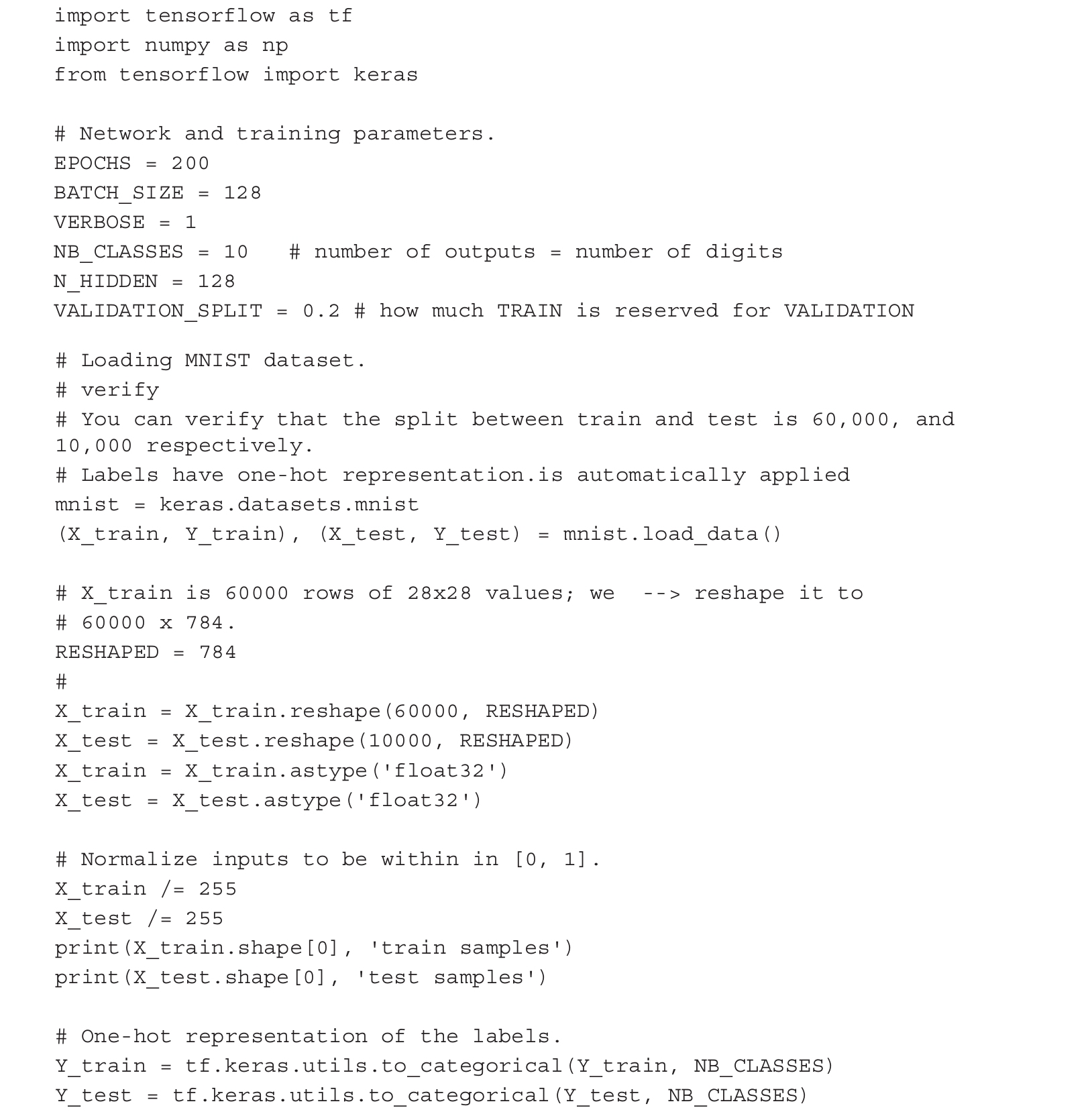 依据Keras的风格,TensorFlow 2.0提供了合适的库(https://www.tensorflow.org/api_docs/python/tf/keras/datasets)来加载数据集并将其拆分为用于调谐网络的训练集X_train和用于评估性能的测试集X_test。当训练神经网络并归一化到[0, 1]时,数据转换为float32类型,以使用32位精度。另外,将正确标签值分别加载到Y_train和Y_test中,并对它们执行独热编码。下面介绍具体代码。